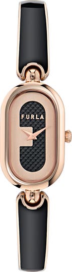 A signature arch logo outlines the guilloche dial on an oval-shaped timepiece powered by quartz movement and set on a mixed-media bracelet.