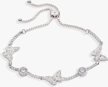 Delicate butterflies take flight around your wrist in this whimsical bolo bracelet, complete with shimmering clear stone accents and intricate snowflake etchings adorning each wing. The charming inline design features butterflies with crisp enamel details that catch the light beautifully, making this piece a playful celebration of nature's most graceful creatures.