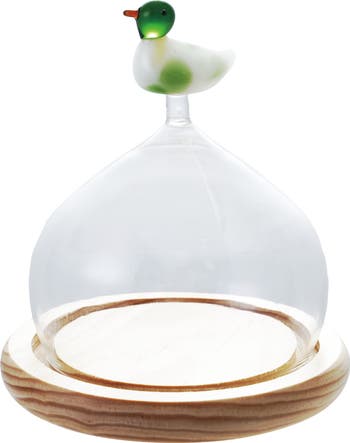 - A A delightful glass cloche featuring a charming duck topper and a natural pine wood base