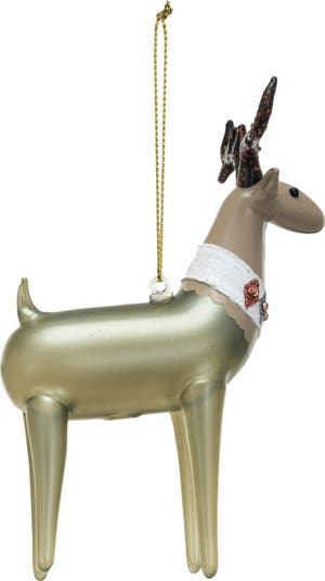This ornament is a glass-crafted depiction of a deer, hand-painted and adorned with jewels and glitter to capture the enchanting allure of a forest inhabitant. The multi-colored design reflects the diversity of nature's palette, while the glitter adds a festive sparkle. Measuring 3.75 inches long, 2.25 inches wide, and 5.25 inches high, it's a significant addition to any holiday decor, inviting onlookers to admire the grace and tranquility of the deer. This is a perfect choice for anyone who loves whimsical and adorable holiday decor.