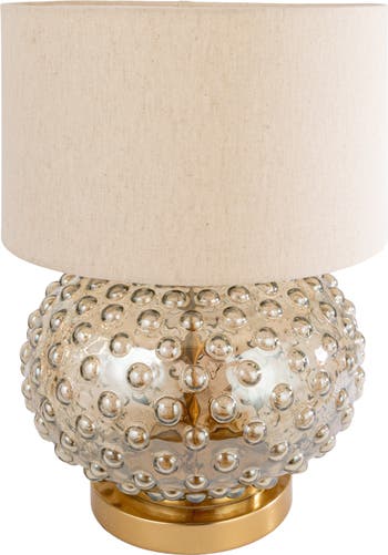 This Glass Hobnail Table Lamp with a brass finish base, cotton shade, and inline switch features a smoke-colored metallic finish, making it a stylish addition to any decor. Made of durable glass and metal, it is perfect for farmhouse, French country, and contemporary styles. This lamp requires one standard bulb (bulb not included) and is 12 inches in diameter and 17.5 inches in height. The smoke-colored metallic finish adds a touch of sophistication to any room, while the sturdy construction ensures durability and longevity. Its elegant design and versatile aesthetic ensure it remains a cherished piece for years to come.