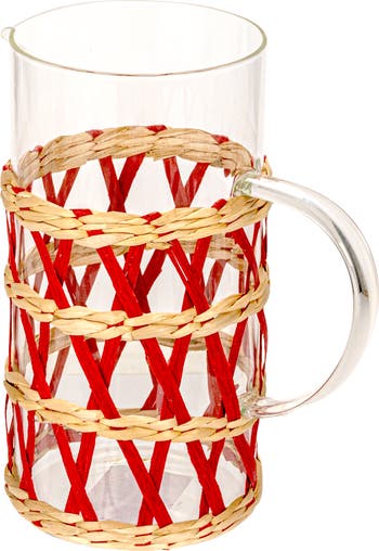 This red and natural glass pitcher with woven sleeve is a stylish and practical addition to any serveware collection. Its clear glass body showcases the color and freshness of the beverage, while the red woven sleeve adds contrast and warmth. The woven sleeve is made of cane, a sturdy and natural material, giving the pitcher a rustic touch. The pitcher can hold up to 1.25 quarts of liquid and is suitable for serving water, juice, tea, or other beverages. It features a curved handle, spout, and round shape for comfortable holding. The pitcher can suit various styles, from farmhouse to boho, coastal, French country, and cottagecore, adding a cozy touch to the table. Measuring 6.5 inches in length, 4 inches in width, and 8 inches in height, it can serve a large group of guests. This natural glass pitcher is perfect for everyday dining or special occasions, impressing guests and enhancing the beverage presentation.
