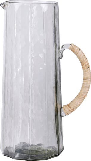 A textural wrapped handle lends nature-inspired style to a tall glass pitcher hand blown from durable recycled pot glass that's suitable for hot or cold liquids.