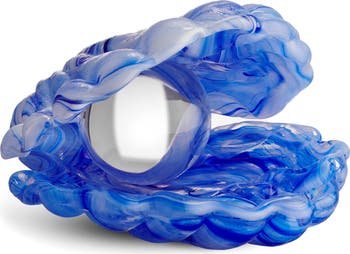 Swirls of color define a glass sculpture designed to look like a lustrous pearl inside a ridged shell.