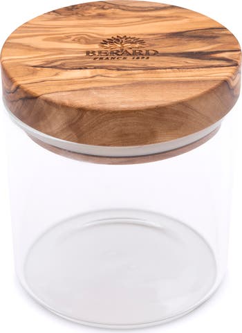 The Berard Glass Storage Jar with Olivewood Lid, 13.5-Ounce, is a beautifully crafted, compact storage solution perfect for organizing small kitchen items. Made with clear, durable glass, this jar offers visibility of its contents, while the olivewood lid, handcrafted from sustainable wood, adds a touch of rustic elegance. The airtight seal ensures your spices, herbs, and other small pantry items stay fresh. Each olivewood lid features a unique grain pattern, making this jar not only practical but also a decorative piece for your kitchen.