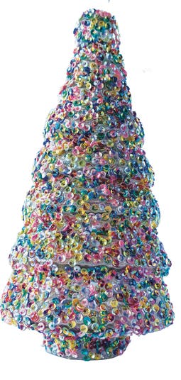 - A dazzling and festive ornament that features a glass tree with sequins in multicolor shades