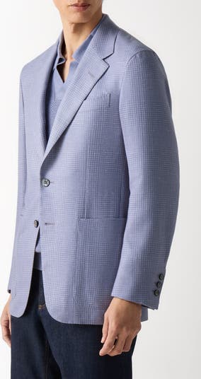Cardigan comfort with a tailored look: this jacket features sport coat styling enhanced by the luxurious feel and impeccable drape of a linen-kissed cashmere-silk blend in timeless glen plaid.
