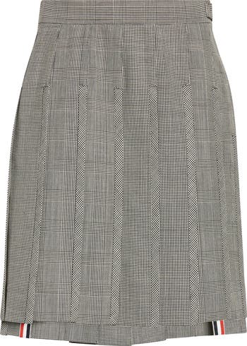 Signature tricolor striped trim peeks out from the split, dropped hem of this schoolgirl-inspired wool skirt featuring a glen plaid print and allover pleating.