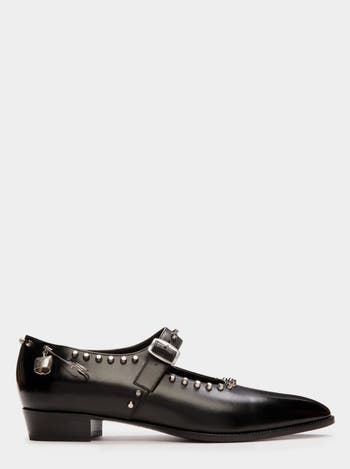 A statement shoe first presented during the Bally SS24 fashion show, the Glendale Mary-Jane is a bold reinterpretation of classic monk-strap styles. Unexpected and iconic, metal studs and Swiss-inspired accessories add extra edge to the black leather upper.