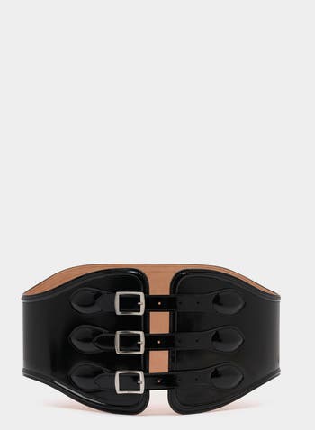 The Glendet belt in black brushed leather has a chic silhouette inspired by corsets. Multiple buckles in palladium-hue metal offer a range of styling options.