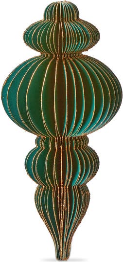 - Add festive sparkle to your home this Christmas with our Glimmer Paper Finial Decor in rich green color perfect for tree hanging or centerpiece display measuring 8 inches long and 4 inches wide and high crafted from high-quality paper for a lightweight and elegant touch to your holiday decorations.