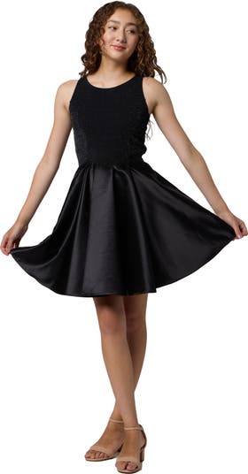 A little glitter with a little satin is a perfect combination for the extra special silhouette. With a stretchy bodice, this dress is a real winner on so many kids.