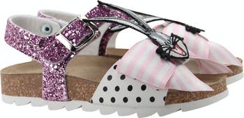 The Glitter Bugs Sandals featuring a polka print toe strap with a Bugs Bunny motif on the front, glitter buckle straps and ribbed rubber sole.