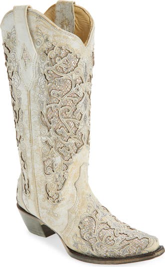 Snakeskin-inspired sparkles and intricate overlays define a whimsical Western boot that keeps you comfortable with plush cushioning and arch support.