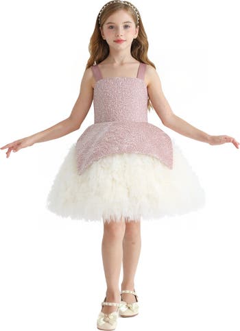 A charming blend of sparkle and softness, this dress features a glittery bodice and a tulle skirt—perfect for parties, portraits, and twirl-worthy moments.