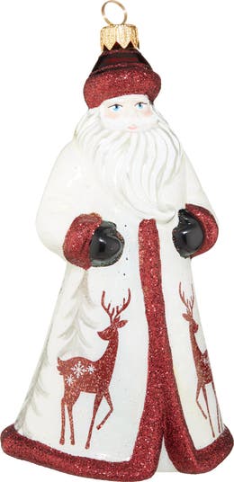 Made from fine blown glass and dusted with sparkly glitter, this handmade Santa ornament celebrates the season with an extra bit of razzle-dazzle.
