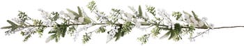 This artificial Christmas garland is designed with two-toned green and white Eucalyptus and Pine leaves, creating a full and luxurious look for your mantlepiece. Decorated with white burrs and berries for a fresh pop of winter's nature. A light sprinkling of glitter adds sparkle for an enchanting touch to your doorways. A great addition to the home or office, bringing a bit of magical, holiday cheer. Product Features: Unlit Pine and Eucalyptus garland Accented with berries and burr thistle Embellished with sparkling glitter Bendable wire center allows you to shape the garland any way you desire Wrapped metal hooks on each end for easy hanging Recommended for indoor use - if using outdoors place under a covered area Dimensions: 5' long x 8” wide Material(s): plastic/wood/metal/foam Note: Branches are compressed for shipment, and need to be fluffed out upon arrival to look like the photo.