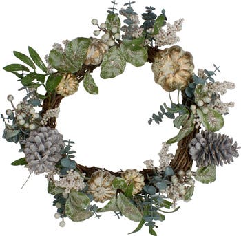 Bring classic Autumn charm into your home with this glittered artificial Autumn twig wreath. This 18-inch Fall harvest wreath is crafted with muted neutral hues and adorned with mini pumpkins, berries, pinecones, pip berry clusters, and mixed Autumn leaves, creating a warm and lifelike seasonal display. The butter yellow mini pumpkins feature brushed bronze details, the pinecones are finished with a soft brushed white coating, and the traditional Fall berries are accented with subtle silver details. The green Fall foliage is lightly dusted with gold glitter to add a radiant, sparkling finish that catches the light beautifully. Designed on a sturdy natural grapevine twig backing, this artificial Fall wreath arrives fully assembled in one piece for fast, hassle-free decorating. Display it on its own or pair it with coordinating Fall garlands, Autumn floral arrangements, faux pumpkins, harvest gourds, Thanksgiving figurines, or other Autumn-inspired décor. Perfect for hanging on your front door, wall, mantel, or covered outdoor porch, this rustic Fall Harvest wreath brings warm seasonal style to any space. Its unlit design allows for easy light customization—decorate with your favorite mini string lights, fairy lights, seasonal bows, ribbon, or clip-on birds to create a personalized Thanksgiving or Autumn look. Recommended for indoor use; if displaying outdoors, place under a covered area to preserve its vibrant color and glittered details for long-lasting use year after year. Ideal for Thanksgiving decorating or enjoying throughout the entire Autumn season, this wreath is a timeless addition to your Fall home décor collection. Product Features: Designed with mini pumpkins, berries, pinecones, pip berry clusters, and mixed Autumn leaves Brushed bronze pumpkins, brushed white pinecones, and silver detailed berries The mixed fall foliage is dusted with glitter for a radiant, sparkling finish Sturdy natural grapevine twig backing for hanging