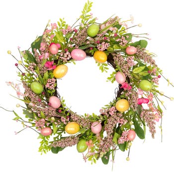 This vibrant Easter wreath features an eye-catching mix of pink, yellow, and green eggs, each adorned with shimmering iridescent glitter. Accented with delicate hibiscus flowers and traditional pip berry clusters, it’s the perfect blend of festive and floral. Features: Pink, yellow, and green Easter egg wreath Accented with small hibiscus flowers with traditional and pip berry clusters Green, pink and yellow Easter eggs adorned with iridescent glitter Green mixed foliage throughout Natural twig grapevine backing for hanging Recommended for indoor use only, or covered outdoor use No assembly required - wreath comes in 1 piece Dimensions: 20" diameter (measured from outermost edge to outermost edge across the wreath) Material(s): polyester/twig/wire/plastic