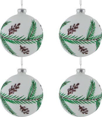 Add a touch of woodland charm to your holiday décor with our white glass ball Christmas ornaments. Adorned with delicate pine needles, rustic pinecones, and shimmering glitter accents, these ornaments bring a cozy and magical feel to any tree. Capture the spirit of the season with these timeless decorations, perfect for adding a holiday sparkle to your celebrations. Product Features: 4-piece set Color: white, green and brown Embellished with glitter Balls are equipped with silver ornament caps Come ready-to-hang on silver cords Dimensions: 4" (100mm) Material(s): glass/metal Note:Set includes 4 of the item shown; total of 4 ornaments