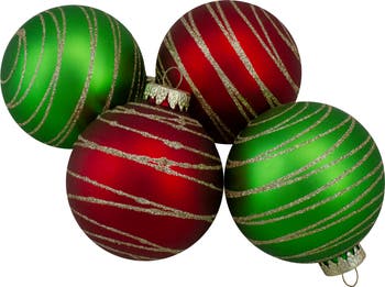Enhance your holiday décor with this set of Christmas glass ornaments. Each ornament features a sophisticated matte finish, adorned with elegant gold glitter crisscrossed stripes. These ornaments are perfect for trimming your Christmas tree or adding festive flair to wreaths and garlands. The traditional holiday colors and shimmering glitter beautifully reflect Christmas lights, adding a touch of sparkle to your seasonal decorations. Product Features: 4-piece set Color: red and green Finish: matte Glitter accents Equipped with gold ornament caps and cords Recommended for indoor use only Dimensions: 3" (75mm) diameter Material(s): glass/metal