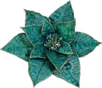 This glittered poinsettia clip features shimmering teal petals trimmed with elegant gold accents, creating a stunning festive bloom. Its sparkling center catches the light beautifully, adding a touch of luxury and charm to any décor. Perfect for wreaths, trees, garlands, or holiday centerpieces, this clip brings a sophisticated sparkle to the season.