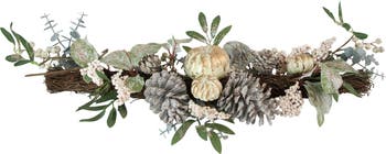 Bring timeless autumn charm to your home with this glittered artificial Fall harvest swag, a stunning Thanksgiving decoration crafted with butter yellow pumpkins, white pip berry clusters, brushed silver traditional berries, and brushed white pinecones. This artificial fall swag is accented with mixed green glittered autumn leaves, adding a touch of sparkle and warmth to your Thanksgiving and Fall décor. Each pumpkin features brushed bronze detailing, while the berries and pinecones are gently brushed in silver and white finishes for a soft, elegant shimmer. Built on a sturdy natural grapevine twig base, this rustic harvest swag offers an earthy, authentic look that perfectly complements farmhouse, traditional, or modern holiday styles. Ideal for autumn decorating or Thanksgiving celebrations, this decorative fall swag can be displayed on your mantel, tabletop, shelf, or console, or combined with other fall harvest decorations such as faux gourds, pumpkins, wreaths, garlands, or floral arrangements. Create a custom Thanksgiving centerpiece by pairing it with flameless candles or fairy lights for a warm, inviting glow. Perfect for indoor use—if displayed outdoors, keep it in a covered area to preserve its soft earth tone hues and glitter accents, ensuring long-lasting seasonal beauty year after year. This artificial fall harvest swag makes the perfect autumn home decoration for Thanksgiving, Fall decor, and seasonal Autumn gatherings. Product Features: Crafted with pumpkins, white berries, pinecones, and mixed autumn leaves Brushed bronze pumpkin details and shimmering gold glitter accents Sturdy natural grapevine twig backing Recommended for indoor use - if using outdoors, place under a covered area Dimensions: 4"H x 36"W x 9"D Material(s): twig/polyester/pinecones/plastic/wire