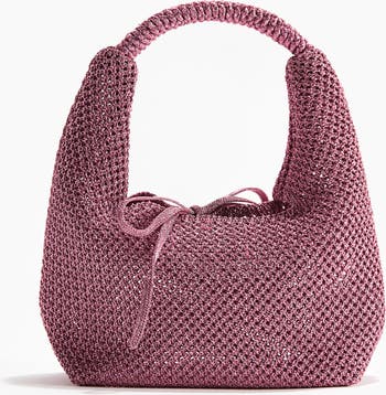 Small handbag in a hole knit containing glittery threads. Features a handle and a narrow tie fastening at the top. Unlined.