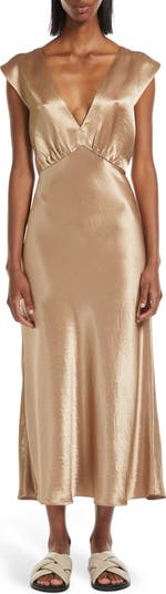 Casually crinkled satin tells a laid-back luxe style story for a slipdress designed with a deeply dipped neckline and wide straps crossing over in back.