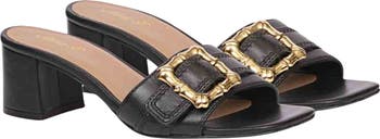 A bamboo-inspired buckle highlights the angular square toe of a leather slide sandal set on a low block heel for a subtle dose of height.