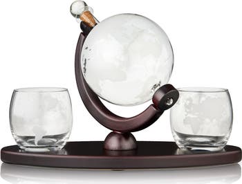 The Globe Decanter & Whiskey Tumblers Set is the perfect way to enjoy high-end liquor in style. This striking set is etched with the continents of the world, creating a beautiful frosted look that perfectly displays the liquid within. Each tumbler features subtle curves to help capture and concentrate aroma for a wonderful nosing experience. This decanter and tumbler set looks amazing in a den, office, or home bar and is an eye-catching conversation starter.