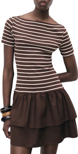 Flouncy layered ruffles romance the skirt of this leggy-length dress featuring a close-fitting striped bodice with a wide neckline.