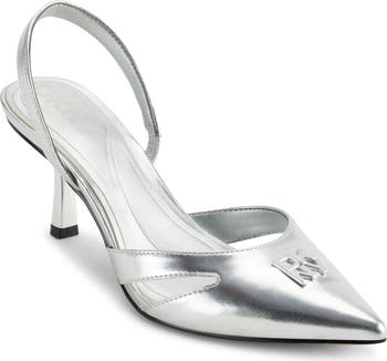 Gleaming logo hardware illuminates the pointy toe of a graceful slingback sandal that's ready to steal the scene.