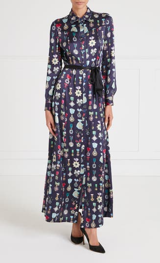 Versatile and elegant, the Gloriette shirt dress is crafted from a silk satin, designed with long sleeves, a button-through front, and a flowing skirt. Featuring a detachable sash belt to cinch the waist. Inspired by the ornate decorations of 19th-century military uniforms and aristocracy. These historical motifs are translated into intricate, jewel-like prints which are hand-painted in-house and meticulously placed to perfect the collaged composition, then rendered in garment sketches and engineered to flatteringly fit the body.