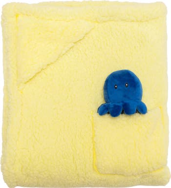 Your little one will enjoy the softness of this cozy fleece blanket that reverses from smooth to plush sides and features a glow-in-the-dark print and octopus plush for even more fun.