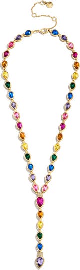 Rainbow-hued crystals shaped like old-timey Christmas-tree lightbulbs brighten up this festive lariet-style necklace that's perfect for gifting.