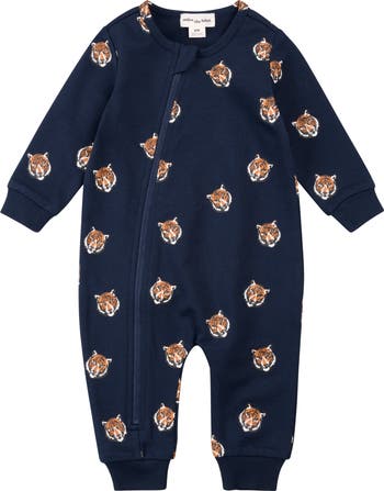 Fierce tigers pattern a comfy stretch-organic cotton romper with a full-length zipper for quick and easy changing.
