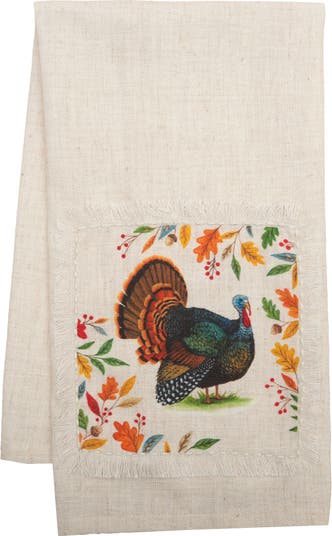 Celebrate the season with the Gobble & Gather Turkey Kitchen Towel. This charming woven and applique towel features a proud turkey in rich autumn hues, standing at the center of a vibrant border of fall foliage. Set against a natural background, this towel brings warmth and festive flair to any kitchen decor, perfect for Thanksgiving or any autumn gathering. Both functional and decorative, it adds a cozy touch to the kitchen while celebrating the beauty of the harvest season.