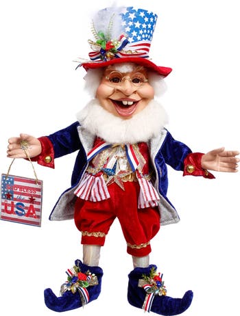 The God Bless The USA Elf (Medium - 19.5 Inches) is a festive collectible dressed in a patriotic red, white, and blue ensemble, complete with velvet fabrics and gold accents. This cheerful elf sports a star-spangled top hat adorned with feathers, ribbons, and sparkly embellishments, exuding American pride. Holding a “God Bless the USA” sign, it’s the perfect decorative piece to celebrate Independence Day or show year-round love for the nation.