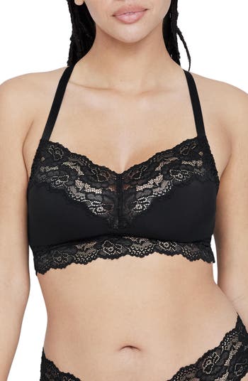 - Over the head style with dramatic lace racerback and wide adjustable stretch matte straps