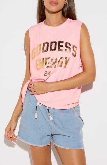 Let your inner goddess shine in this eye-catching tank sporting a metallic graphic on the front.