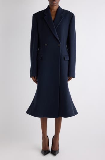 Demna’s signature volume codes find their most commanding expression in this coat, a longline sweep that narrows through the torso then releases into a dramatic flare sculpted by godet-inspired panels. Runway-featured for fall ’25, it’s tailored in warm brushed wool with a luxurious cupro lining that glides over layers while structured shoulders and a clean double-breasted front hold the stance with authority.