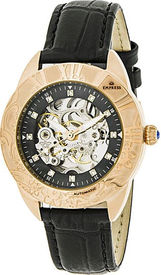 The Empress Godiva — where elegance meets engineering. Wrapped in a refined leather band for timeless comfort and style, this timepiece showcases a combo Mother-of-Pearl and skeleton dial that reveals the artistry within. Crystal markers add a touch of brilliance, making every glance a statement of sophistication. The Empress Godiva isn’t just a watch — it’s a bold expression of refined power.
