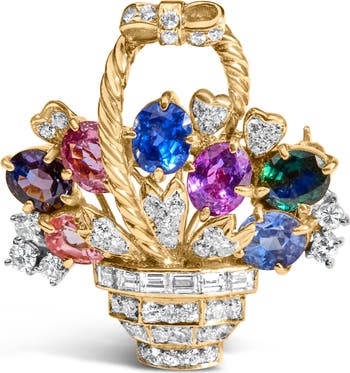 Immerse yourself in the epitome of luxury and versatility with this dazzling 18K yellow gold flower basket, which gracefully transitions between a pendant and a brooch. Crafted with a sumptuous floral bouquet motif, it features 1 1/10 carats of natural diamonds, their cuts ranging from the precision of baguettes to the classic allure of rounds. Each diamond sparkles with a G-H color and pristine VS1-VS2 clarity, echoing the shimmer of morning dew. Amidst these jewels nestle vibrant, color-treated sapphires and a majestic amethyst, each gemstone naturally sourced and enhanced to achieve its peak color, ensnaring the eye with its vivid spectrum. This exquisite adornment promises not only to elevate your ensemble but also to connect you deeply with the artistry and heritage of fine jewelry.