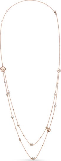 Diamonds and pearls are spaced along a delicate cable chain in this chic 18k rose gold station in a double strand design that can be worn with a variety of different styles. Multi-sized Chinese freshwater cultured round ivory pearls in cup settings are stationed along with round white diamonds secured within bezel settings claiming a total 1/2 cttw with an approximate G-H Color and SI1-SI2 Clarity. The contemporary cable chain is adjustable up to 16" to 20" in length to complete your look and it secures with a lobster claw clasp. Pearls range in size from 6 MM to 9MM.