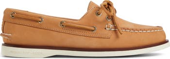 Practical rawhide laces top a well-made boat shoe crafted in a classic moc-toe silhouette with a wave-siped sole for traction on wet surfaces.