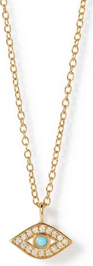 This 18 carat yellow gold plated silver pendant necklace features the Evil Eye symbol with a turquoise pupil and cultured white sapphire gemstone pave. Its elegant chain is finished by the signature Astley Clarke star-set white sapphire tag.