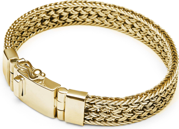 Handcrafted braided chain bracelet made from gold-plated 925 sterling silver with a secure, engraved clasp. Each piece is unique, reflecting artisanal craftsmanship and subtle variations in size, shape, and color. Designed to be worn alone or stacked for a personalized look.