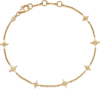 Resembling radiant stars floating in space, this Celestial station bracelet was made to be layered. Crafted from 18 karat gold plated sterling silver, the bracelet is decorated with starburst motifs set with cultured white sapphires and is adjustable to three lengths for the perfect fit. Ideal for bringing a bright touch to your bracelet stacks, this gold bracelet makes a meaningful gift or a statement addition to your own jewelry box.