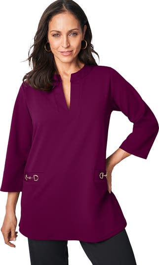 - Give your workweek wardrobe a chic refresh with this split neck tunic. The A-line silhouette is crafted to flatter your figure, and the gold metal horse bit trim at the pockets adds a touch of sparkle. A-line silhouetteSplit neckline Three-quarter sleevesGold metal horse bit trim at pockets30&rdquo lengthPolyester/spandexMachine washableImported